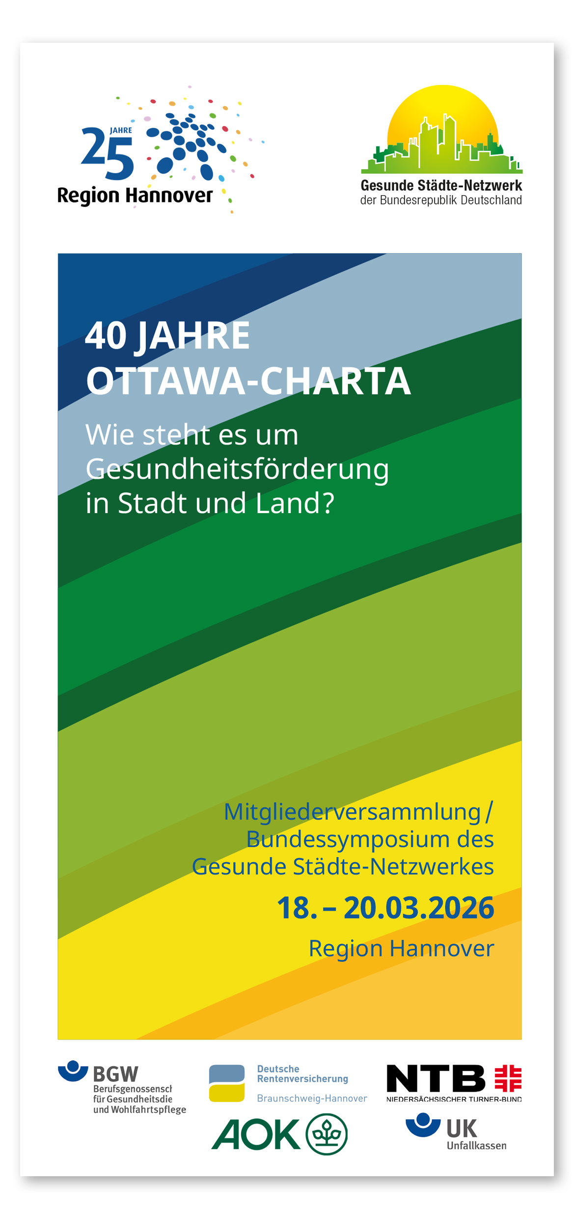 Auf dem Bundessymposium 2026 des Gesunde Städte-Netzwerks, ausgerichtet von der Region Hannover, wollen wir entlang der fünf Handlungsfelder der Ottawa-Charta in den Austausch kommen und dabei aus guten Erfahrungen ebenso wie aus Fehlern – und vor allem: voneinander – lernen. Wir wollen diskutieren, wie die Ottawa-Charta unter den aktuellen Krisen und Herausforderungen gestaltet werden müsste.